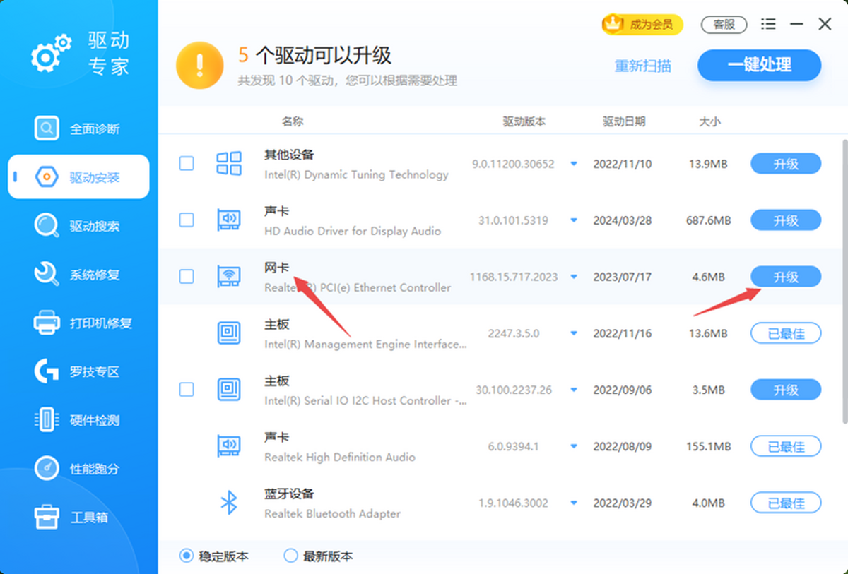 2、软件自动检测电脑驱动,可升级项目旁会显示升级按钮,点击即可更新。