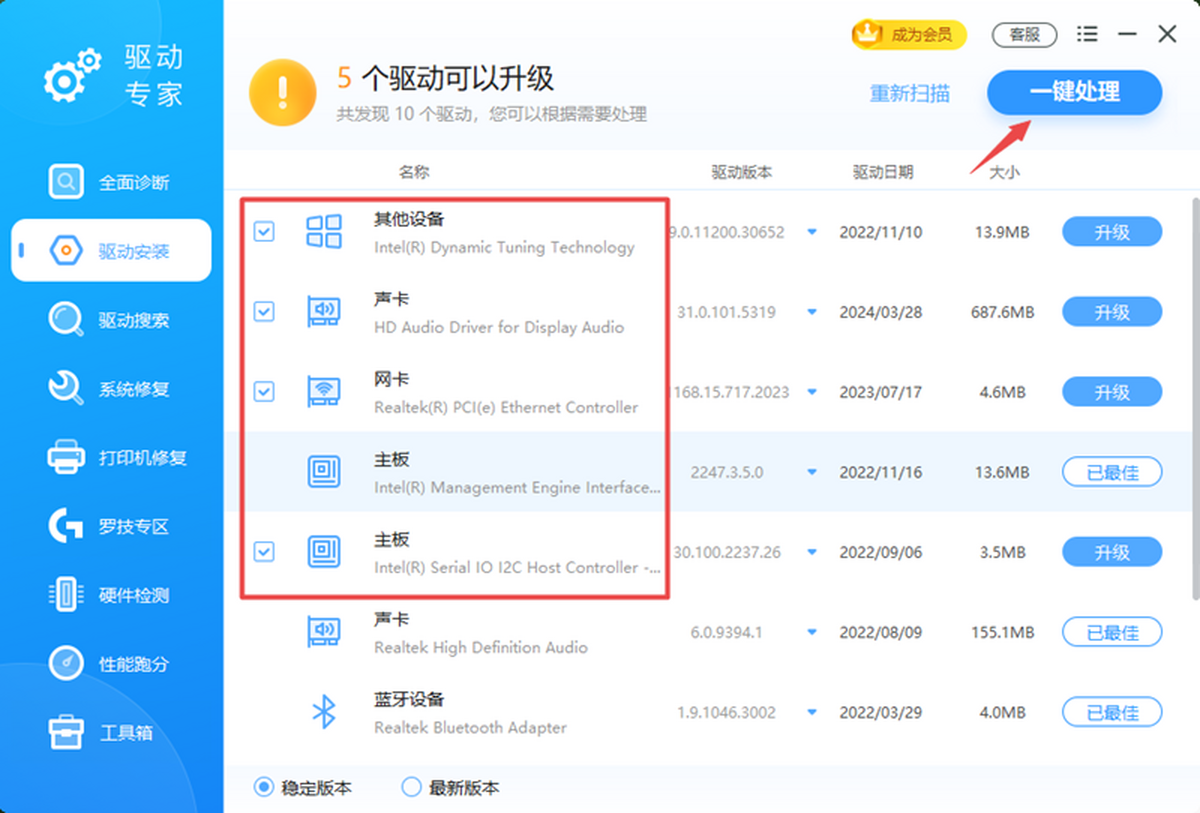 3、勾选需要升级的驱动,点击右上角一键处理,即可完成全部更新。