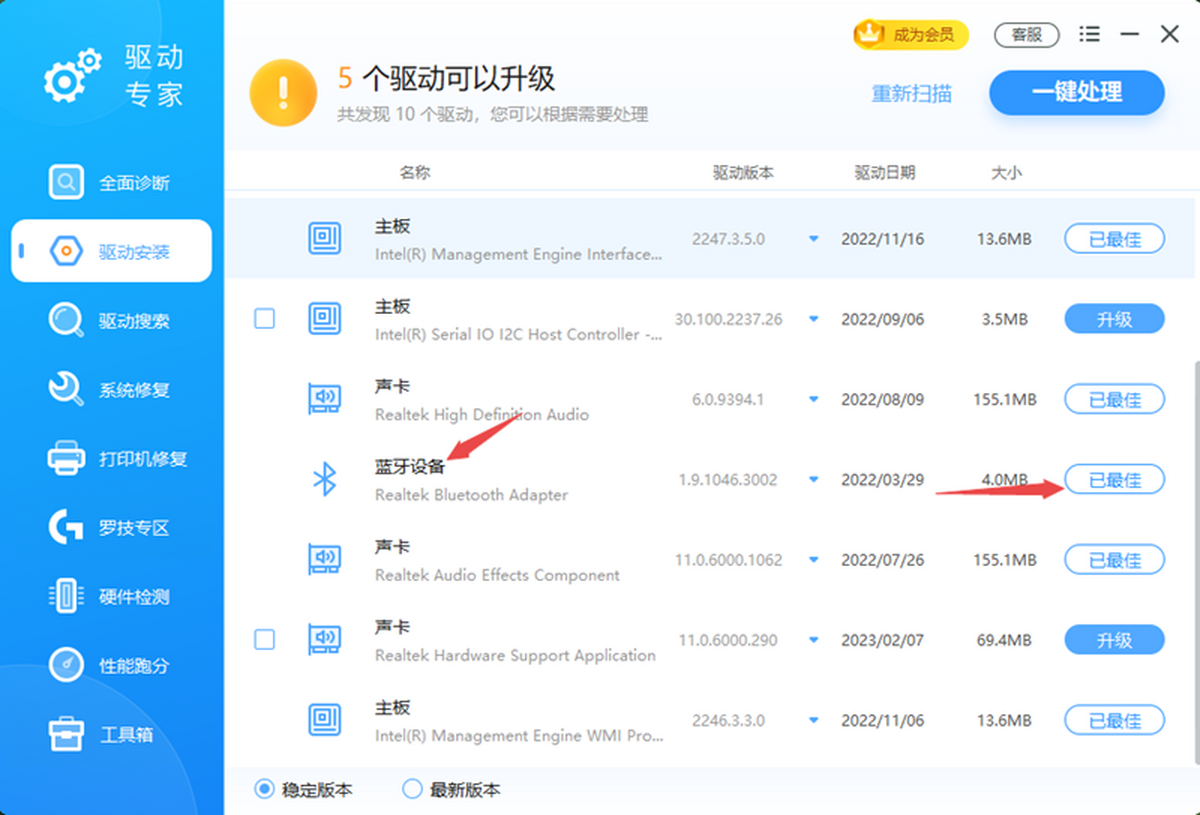 2、软件扫描系统驱动,状态为已最佳的项目,将光标移至按钮上方。