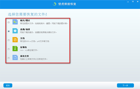 3、选择需要恢复的文件类型,确认后单击下一步,进入后续操作环节。