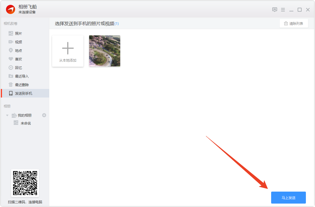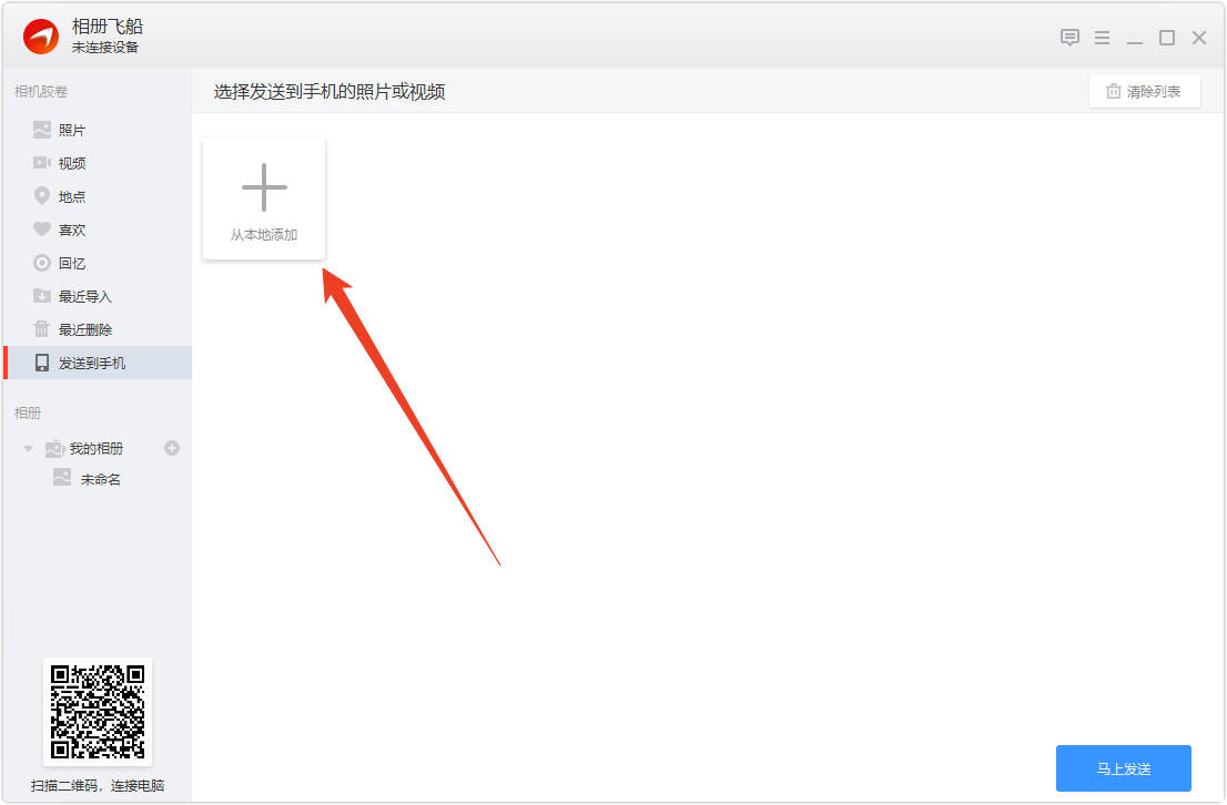 3、双端直连后可进行照片传送,点击加号,可从电脑本地加载各类照片或视频文件。