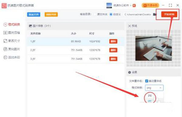 3、在右下角设置栏目中,选择图片要转换的格式类型,点击右上角“开始转换”即可。