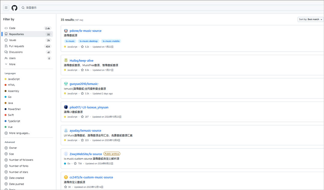 4、插件可在国内gitee或国外github平台,搜索音乐源关键词,就能找到大量可用插件。
