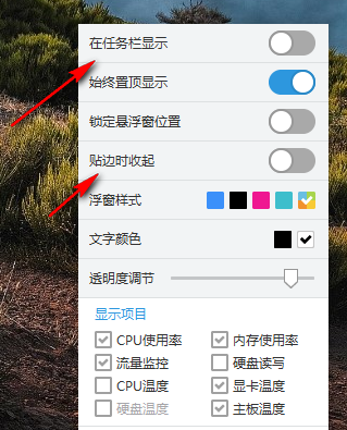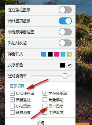 3、勾选需要查看的监控项目,勾选完成后,对应内容会同步显示在悬浮栏上。