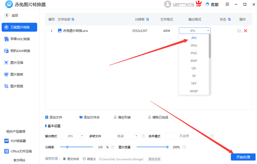 3、选择输出格式为JPG(或其他所需格式),点击右下角“开始处理”按钮即可。