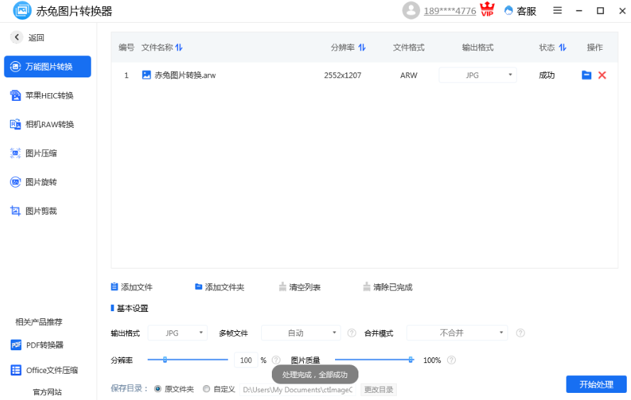 4、处理完成后,页面会显示处理结果,状态提示为成功,即完成ARW转JPG操作。