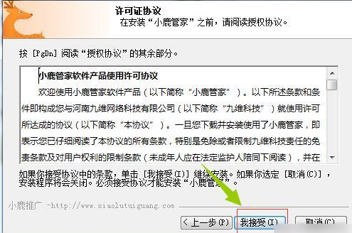 1、打开小鹿管家安装包,进入安装界面后,接受软件许可协议,继续安装流程。