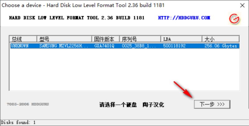 3、打开格式化工具,在列表中点击U盘设备,点击下一步即可完成格式化;