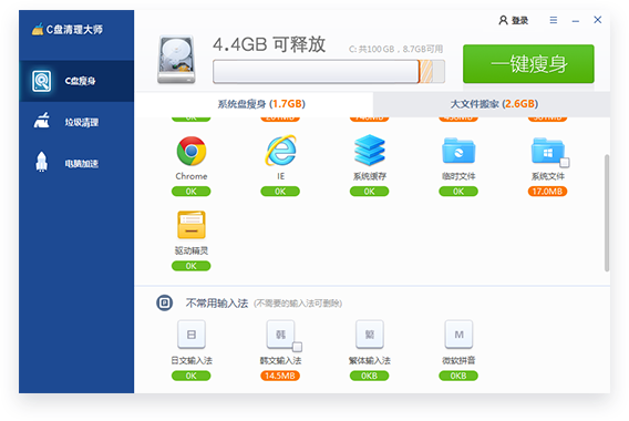 2、C盘瘦身:深度扫描C盘冗余文件,一键完成瘦身操作,快速释放空间,操作高效便捷。